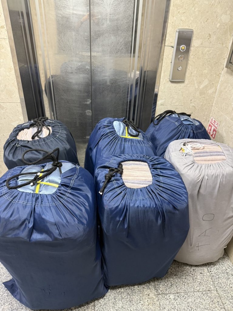 ちょうどタオルの搬入業者とエレベーターが一緒に。
