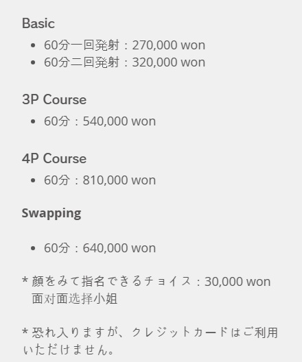 基本は60分1回発射で27万ウォン(日本円で2万8千800円くらい)のコース。